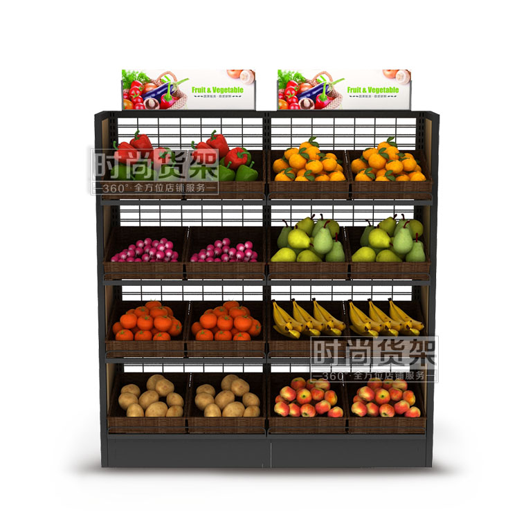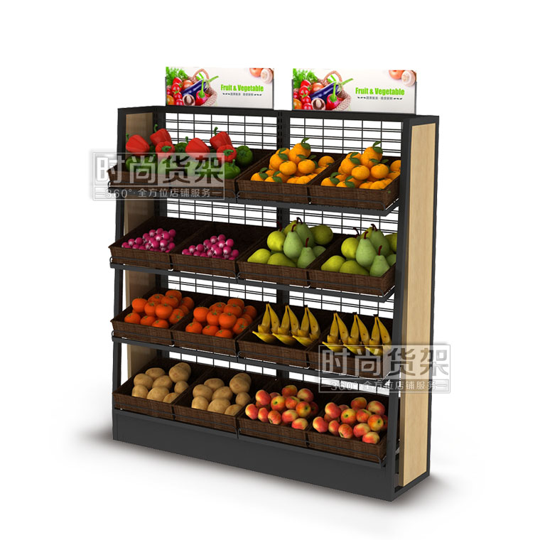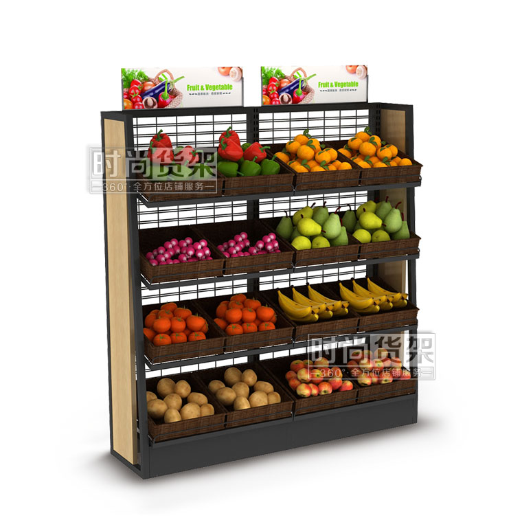 【描述】采用優(yōu)質(zhì)鋼立柱,網(wǎng)狀背板,可有效節(jié)省成本 ;層板可調(diào)節(jié)設(shè)計(jì),可根據(jù)果蔬的重量和數(shù)量來(lái)調(diào)節(jié)貨架的層數(shù);層板上可以搭配棕色的藤框,凸顯自然美觀,可有效區(qū)分果蔬種類,方便顧客選購(gòu)。