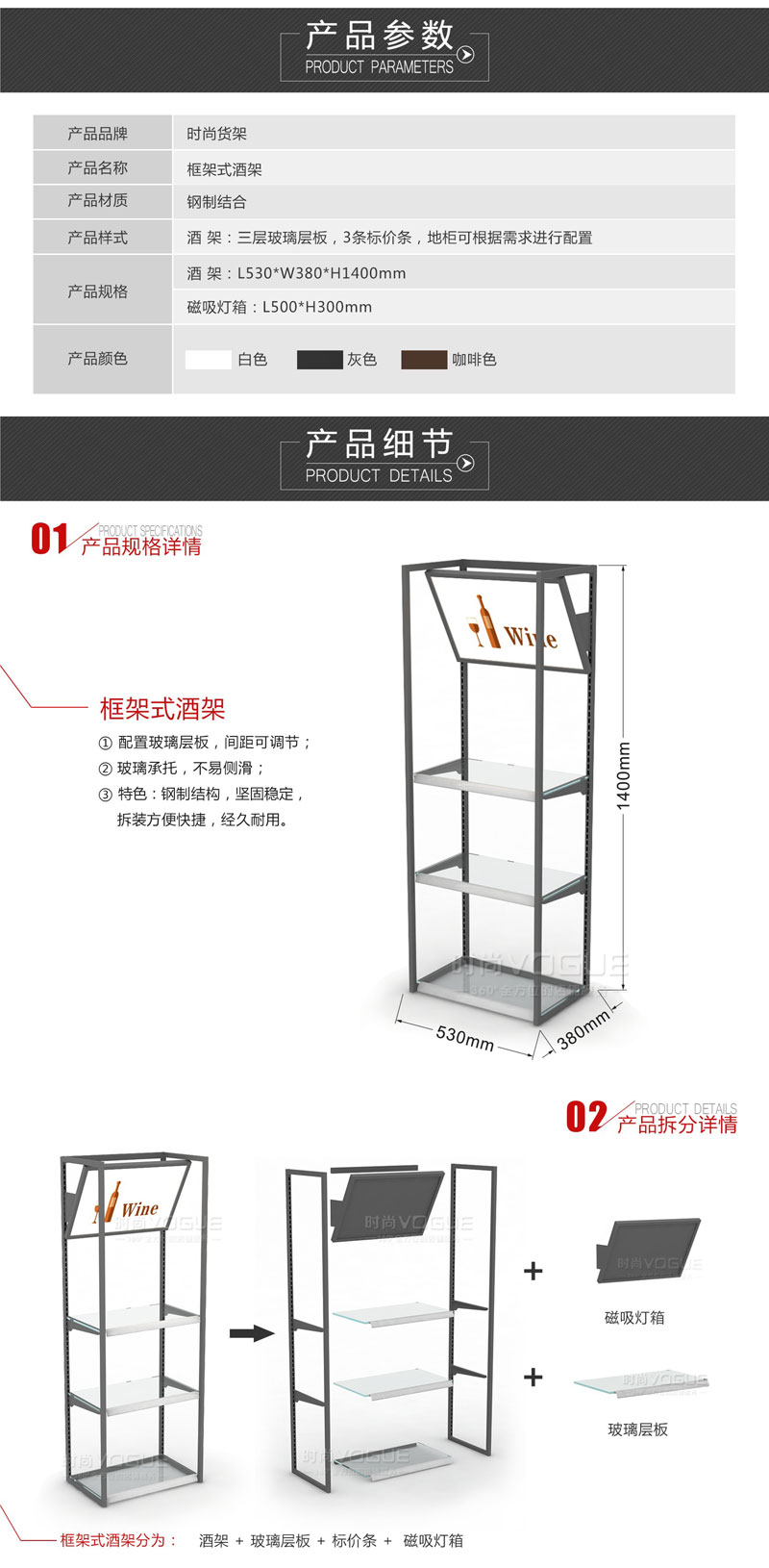 4、時(shí)尚貨架所售產(chǎn)品均是可拆卸的組合貨架,價(jià)格要根據(jù)具體型號(hào)、款式及配件數(shù)量來決定。