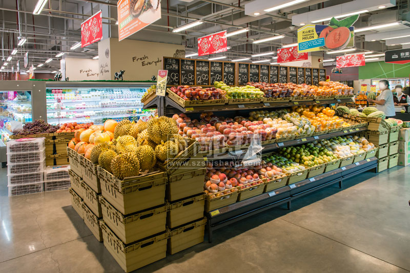 果蔬生鮮一直是超市的重點(diǎn)銷售區(qū)域,“樂購express”果蔬區(qū)采用了專用的果蔬中島貨架,采用斜角度層板,層板式放置不同高度的木框,每個(gè)木框可陳列不同的果蔬產(chǎn)品,并在中島架旁邊放置大型果蔬陳列架,整體陳列效果令人滿意!