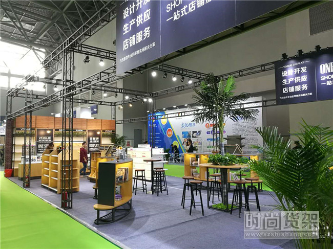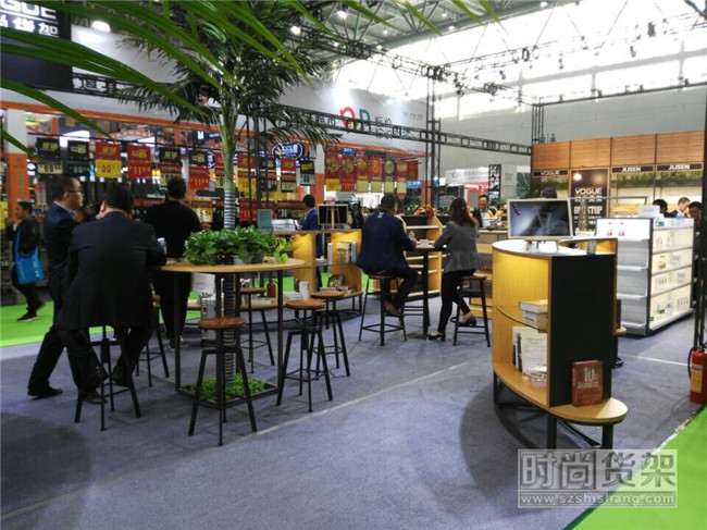 時(shí)尚貨架展位內(nèi)還特意擺放了幾組吧臺,既方便讓觀眾坐下來了解貨架產(chǎn)品,又可供觀眾休息歇腳。