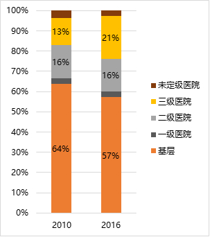 同時,基層的診療人次占總體醫(yī)院和基層診療人次的比例從2010年開始就逐漸降低,從2010占64%下降到2016年的57%,而三級醫(yī)院的占比仍保持攀升,從2010年占比13%上升到21%,二級醫(yī)院、一級醫(yī)院以及未定級醫(yī)院的占比都沒有明顯變化。