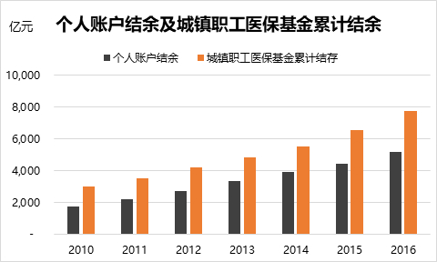 根據(jù)《2016年度人力資源和社會保障事業(yè)發(fā)展統(tǒng)計公報》的數(shù)據(jù),2016年,個人賬戶結(jié)余達(dá)5200億元,而當(dāng)年的城鎮(zhèn)職工醫(yī)?;鸾Y(jié)余為7772億元。在2010年到2016年之間,個人賬戶結(jié)余的年平均增速為20%,城鎮(zhèn)職工醫(yī)?;鹄塾嫿Y(jié)余的年均增速為17%。