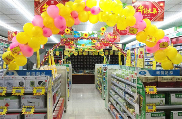 將顏色鮮艷的氣球做成龍門,布置在陳列保健品的藥店貨架周邊,打破藥店死板固有的死板形象,吸引顧客注意力,讓顧客駐足選購(gòu)。