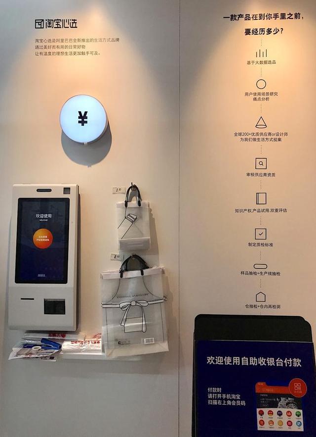這家店也在著力突顯“智能”和“數(shù)字化”——門口有一個(gè)自動(dòng)販賣機(jī),開(kāi)業(yè)第一天,附近的居民不少來(lái)排隊(duì)領(lǐng)取免費(fèi)的購(gòu)物袋。店面盡頭有一個(gè)自助結(jié)賬機(jī)器,需要打開(kāi)淘寶掃描會(huì)員碼,也可以在大潤(rùn)發(fā)收銀臺(tái)結(jié)賬。這家店 3 公里周邊消費(fèi)者也可以在手機(jī)淘寶和大潤(rùn)發(fā)優(yōu)鮮 APP 上選購(gòu)淘寶心選的商品,有 1 小時(shí)到家的配送服務(wù)。