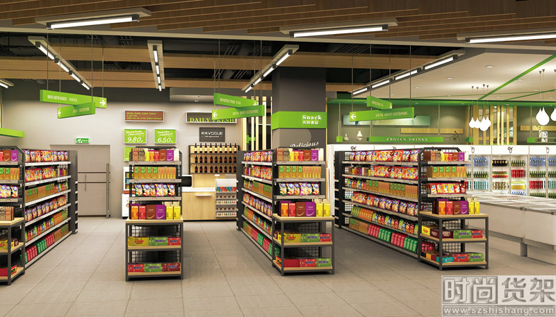 下面【時尚貨架】小編就介紹以下,時尚貨架為社區(qū)便利超市設計的一整套陳列方案。包含:商品陳列區(qū)、果蔬區(qū)、休閑區(qū)、收銀區(qū)。