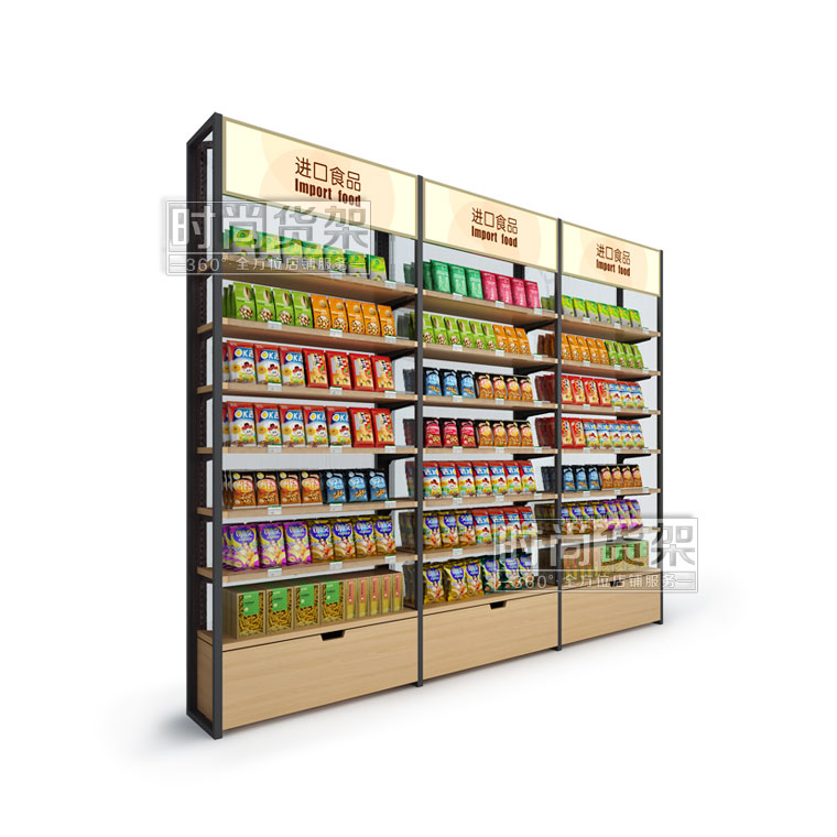 【特點(diǎn)】木質(zhì)地柜的配置讓這款便利店貨架商品儲(chǔ)藏空間更大,合理地利用了便利店內(nèi)每一寸空間。貨架頂部的燈箱設(shè)計(jì)不僅能對陳列的商品進(jìn)行分類指示,更能增強(qiáng)商品展示效果,吸引顧客的注意,從而產(chǎn)生顧客的購買行為。