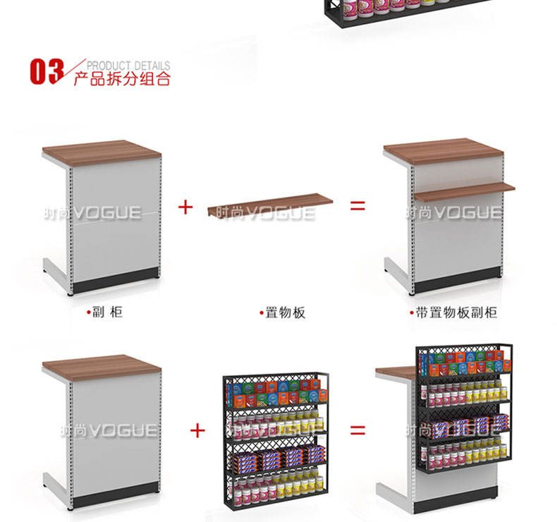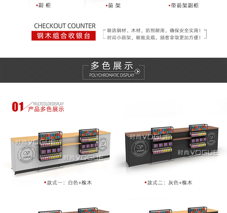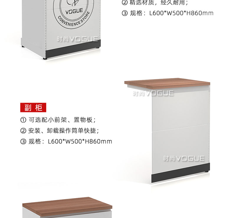 【特點(diǎn)】組合形式,滿足不同收銀區(qū)需求;精選材質(zhì)使用壽命長;擴(kuò)展側(cè)面空間增強(qiáng)收銀臺功能