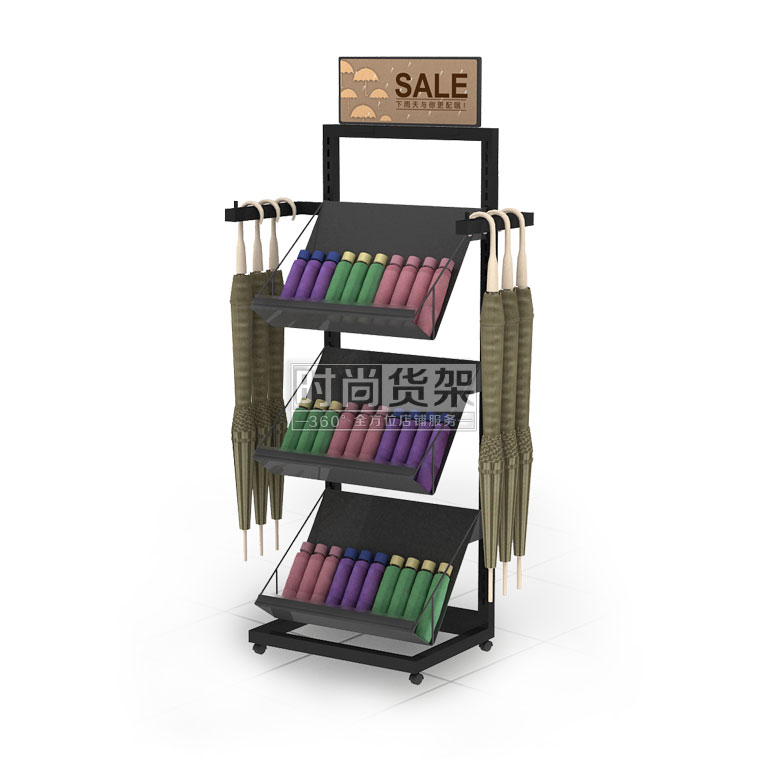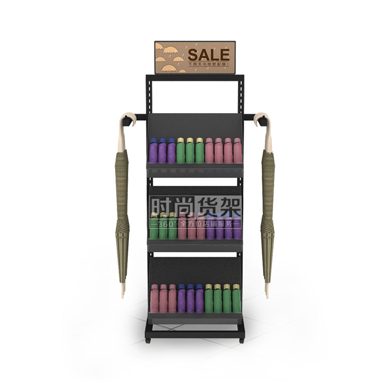 【描述】啞光的深灰色設(shè)計,讓外觀更顯現(xiàn)代時尚;采用優(yōu)質(zhì)冷軋鋼,真材實料,加粗立柱,結(jié)構(gòu)穩(wěn)固,不易刮蹭掉色,歷久如新;帶有傾斜角度的層板,三面均設(shè)計了護欄,有效防止商品的散落,同時這樣的傾斜角度,更符合消費者的購物視角,充分展示不同雨傘的大小、樣子;卡扣式的層板便于調(diào)整高度,輕巧易于安裝擺放